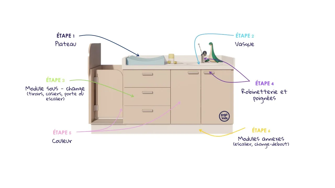 Notre configurateur de plans de change intègre 700 choix de personnalisation en toute autonomie, testez le ! Le service Ergokids d’ATHEX vous accompagne également pour personnaliser votre crèche dans une réflexion globale d’aménagement.